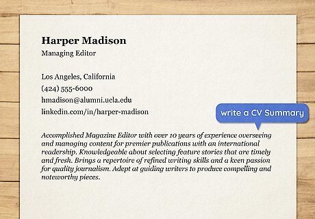Create a CV Objective or CV Summary. Craft a short paragraph that’s 100 words or less. Tell recruiters and employers why you’re the best candidate for the role. If you have less work experience, use a CV Objective to discuss your knowledge and skills. On the other hand, if you have a strong background in your chosen field, stick to a CV Summary to expand on what you’ve accomplished. A recent college grad with an MFA (Master in Fine Arts): Independent and dynamic writer with a Master of Fine Arts in Film & Television offers a wealth of knowledge about cinematography and the craft of thought provoking documentaries. Seeking to join National Geographic to curate and create exceptional content that educates a global audience. A seasoned professional with 11 years of experience as a magazine editor: Accomplished Magazine Editor with over 10 years of experience overseeing and managing content for premier publications with an international readership. Knowledgeable about selecting feature stories that are timely and fresh. Brings a repertoire of refined writing skills and a keen passion for quality journalism. Adept at guiding writers to produce compelling and noteworthy pieces.