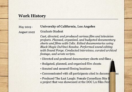 Share your work experience. Read the job description and include information about your work experience that’s relevant to the position. For example, if you wish to work for an engineering firm, mention your responsibilities as a lab tech. Use action verbs (like “researched” and “implemented”) and be sure to include achievements (such as “streamlined laboratory procedures by 35%"). Graduate Student UCLA — May 2019 - August 2022 Cast, directed, and produced various film and television projects. Planned, organized, and budgeted documentary shorts and films with Celtx. Edited documentaries using Black Magic DaVinci Resolve. Performed sound editing with Sound Forge. Conducted interviews, curated archival footage, and wrote scripts. • Directed and produced documentary shorts and films • Budgeted, planned, and organized film shoots • Scouted and secured filming locations • Communicated with all participants cited in documentaries • Produced The Last Laugh: Female Comedians Bite Back, a project that was showcased at the DOC LA Film Festival