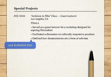Organize information with bulleted lists. If there's a part of your CV that isn't self-explanatory and requires extra details, then use a bullet point list to get your message across. Stick to short statements with action verbs so recruiters and employers visualize how dynamic and hard working you are. Special Projects "Activism in Film" Class — Guest Lecturer July 2022 Los Angeles, CA FilmLA • Served as a guest lecturer for a workshop designed for aspiring filmmakers • Facilitated a discussion on culturally responsive practices • Outlined how documentaries are a form of activism