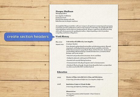 Create section headers to separate different parts of your CV. Break up all the information and group details by a common theme. For example, make a header that says "Education" and expand on your academic career underneath it. Headers show you put effort into organizing your CV and make it more digestible.
