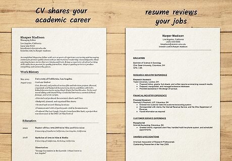 A CV shares your academic career, while a resume reviews your jobs. CVs are great if you've spent most of your time in academia. For example, you might've recently graduated, are still studying, or wish to pursue a position in higher education. You might've also invested a lot of effort in research or published many papers, so you'd like to share that. If everything you've done during your academic path is extremely relevant to a role you're interested in, then a CV is also an excellent choice. If you've spent most of your life working and have plenty of job experience, it's probably better for you to make a resume—especially if you weren't in higher education for a very long time.