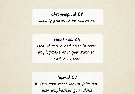 Select 1 of 3 CV formats—chronological, functional, or hybrid. A chronological CV lists your jobs starting with the most current one at the top. A functional CV focuses on your skills and experience and does not follow your chronological work history. A hybrid CV combines both the chronological CV and the functional CV—it lists your most recent jobs but also emphasizes your skills. A chronological CV is the most common format and is usually preferred by recruiters because they get a sense of your recent work history. A functional CV is ideal if you've had gaps in your employment or if you want to switch careers, so you only want to share some of your work history. A hybrid CV allows you to expand on your skills. For example, you can start with a "Skills Summary" section, then share your "Work Experience" section.
