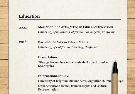 Give an overview of your education. List your graduation year—if you're still working on your program, use your expected graduation date—your degree, the name of your institution, and any honors you earned. If you have little to no work experience, place your "Education" section above your "Work Experience" section and go into more detail about your academics. If you just graduated, you might want to include: The title of your dissertation Your favorite fields of study Coursework that's relevant to the job you want Your key achievements Your extracurricular activities Education Degrees: Master of Fine Arts (MFA) in Film and Television (2022) University of Southern California, Los Angeles, California Bachelor of Arts in Film & Media (2018) University of California, Berkeley, California Dissertation: "Strange Encounters in the Eastside: Urban Unrest in Los Angeles" International Study: University of Belgrano, Buenos Aires, Argentina (Summer 2019) Latin American Cinema, Human Rights and Cultural Representation Honors and Scholarships: Charles F. Scott Fellowship ($15,000) Marilyn Yarbrough Dissertation Award ($36,000) Coursework of Interest: Documentary Research Methodologies Feature Film Writing Extracurriculars: Vice President of The Film & Photography Society at UCLA Mentor for the Youth Cinema Project