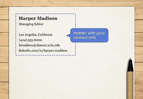 Include a header with your contact information. At the very top of your CV, share your full name, address, phone number, email address, and LinkedIn profile. While employers don’t need to know your street address, it’s important for them to know where you’re based—for example, you might need to work in the same time zone or be familiar with where their operations take place. The rest of your contact information allows them to follow up about the position you applied for. Harper Madison Los Angeles, California (424) 555-6000 [email protected] linkedin.com/in/harper-madison