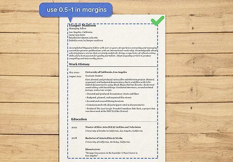 Make sure your margins are between 0.5–1 in (1.3–2.5 cm). Set 0.5–1 in (1.3–2.5 cm) margins on all 4 sides of your CV. While margins might seem minor to you, they instantly create a formal polish and make your CV easier for recruiters and employers to read. Proper margins help people skim over your CV. Plus, with 0.5–1 in (1.3–2.5 cm) margins, you can fit more on the page. Most CVs should be 1 page unless you've had 5-10 years of relevant work experience.