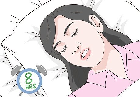 Get at least 8 hours of sleep every night. Being well-rested can help to reduce your anxiety the following day and improve your overall mood. Go to bed and wake up at the same time each day to ensure that you get at least 8 hours of sleep. Some other strategies that may help you to get more sleep include: Avoiding caffeinated beverages in the afternoon and evening. Turning off all electronic devices at least 30 minutes before bedtime, such as your phone, TV, and computer. Making your bedroom a cool, quiet, dark oasis for sleeping. Tip: Although it’s optional, decorating your bedroom might also help to make it more relaxing. Invest in some nice sheets, get a cute lamp to place on your bedside table, or hang a few relaxing pictures on the wall.