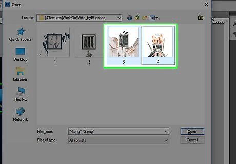 Open the images you want to edit. Do so by pressing Ctrl+O (Windows) or ⌘+O (Mac), selecting the image files you wish to open, and then clicking Open in the lower-right corner of the dialog box.