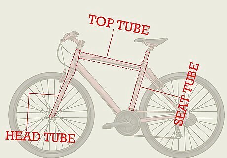Know how to measure a bike's frame size. The main factor in buying the right bike is the frame size. The frame is the metal body of the bike, and it is measured in three key places. While most bike frames utilize only one measurement for sizing, knowing how to locate all three is key to getting the right size bike. Seat Tube: This is the vertical bar between your seat and the pedals. It is measured to the center of the crankshaft, which is the circular disk that your pedals attach to. Top Tube: This is the horizontal bar between your seat and the handlebars. It affects your "reach" towards the handlebars. Head Tube: This is the small vertical area on the front of your bike, measured between from where it begins to fork around your front wheel and the handlebar stem. It also affects your "reach" to the handlebars.