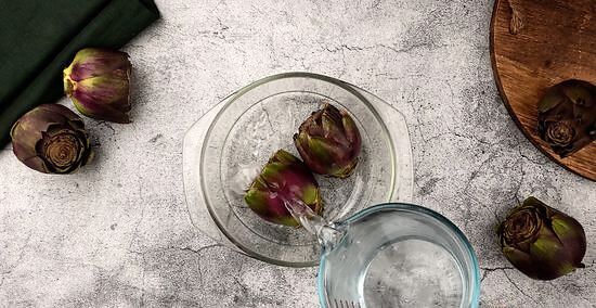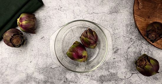 Place your artichokes in a dish. Get a glass microwave-safe dish big enough to contain all your artichokes. Place your artichokes in the dish with the stem-end up in the dish. If you don't have a glass dish, another microwave-wave safe dish big enough to hold your artichokes should be sufficient. However, you will be adding water so you need something like a bowl or pan over a plate.