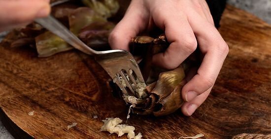 Clean out the thistle of the artichoke. The center of the artichoke is called the thistle. Pull out the smallest petals surrounding the artichoke's center. From there, scrape out the hairy bits you see at the center. Only scrape out the hairy bits of the artichoke, as you want to leave the heart intact.
