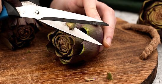 Remove the tips of the leaves. Artichokes have leaves that circle the stem. The tips of these are sharp and pointy, so they should not be eaten. Before microwaving your artichoke, use a pair of scissors or kitchen shears to snip the pointed tip off each leaf.