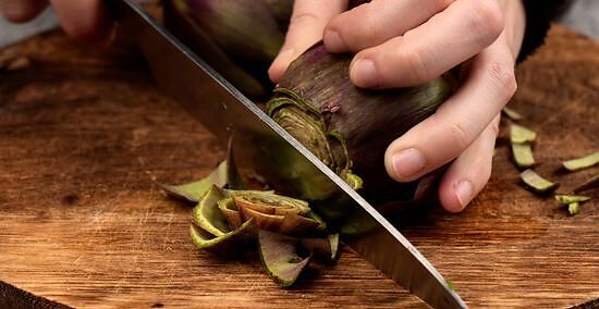 Tim the top and bottom. Cut half an inch from the stem at the bottom of each artichoke. Then, trim about half an inch from the top of each artichoke. Make sure to use a sharp knife. Artichoke are somewhat tough before they're cooked.