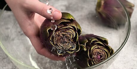 Rinse the artichokes. You should always rinse produce before eating it. Rinse your artichokes under running water, turning them as necessary to get the full surface washed. Use your fingers if necessary to remove any excess dirt.