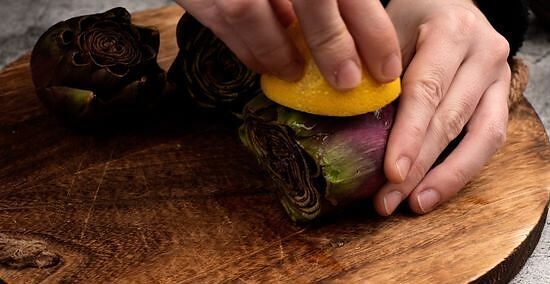 Rub the artichoke with lemon. Lemon will help the artichoke from browning during cooking. Cut a lemon in half and rub down the full surface of the artichoke. Pay special attention to the trimmed edges. These tend to brown the easiest.