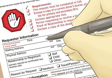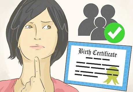 Make sure you can receive the birth certificate. Birth certificates are only issued to certain people. To obtain a birth certificate for someone other than yourself, you must be related to the person. This includes: spouse, parent, stepparent, legal guardian, grandparents, great grandparents, siblings, half-siblings, children, grandchildren, and great grandchildren. You must provide proof of the familial relationship before the birth certificate can be issued. Those entitled to obtain a copy include the registrant, parents, grandparents, great grandparents, grandchildren,stepparents, siblings, spouse, adult children, legal guardian, and legal representatives. Legal guardians and legal representatives of any family members with proof of client relationship can request birth certificates. This may include a notarized letter giving the representative permission. The application provides special options for adoptions, including the adoptive parents or adopted individual.