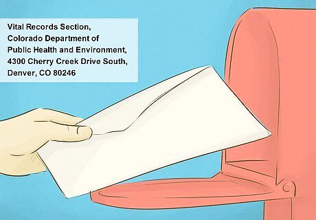 Mail your application. You can also mail your application to: Vital Records Section, Colorado Department of Public Health and Environment, 4300 Cherry Creek Drive South, Denver, CO 80246. Make sure to include a check, money order, or your credit card information in the envelope.The check and money order should be payable to Vital Records. Do not send cash when mailing the application. This method takes around 3 weeks.