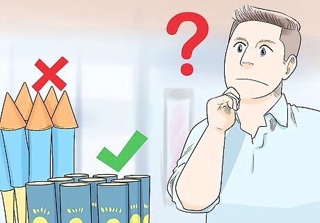 Start by researching the laws for your country. Knowing the laws in your country will quickly narrow down the types of fireworks you can purchase. For example, many countries permit consumer-class fireworks, which include fountains, cones, and firecrackers, although not all do. In the U.S., make sure your fireworks are approved by the U.S. Consumer Product Safety Commission (CPSC). Ground-based fireworks can not have more than 5 mg (0.00018 oz) of powder, while aerial fireworks can not have more than 130 mg (0.0046 oz) of powder. Fireworks can not burn for longer than 9 seconds, and fuses can not burn for less than 3 seconds.