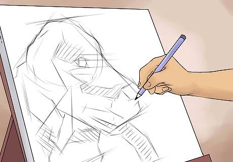 Sketch the under-structure. Begin by drawing the major lines of action. Draw straight lines between the key features, making sure the angles are accurate. Using simple lines makes it easy to adjust proportions before drawing in more complicated forms. Resist drawing small details and focus instead on correctly placing the biggest forms. The sketch should show accurate proportions. Keep adjusting your guidelines until all the forms are the correct size.
