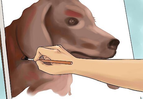 Map out the proportions of your subject. Ensure that the proportions of your painted subject are correct by mapping out key features in the reference for comparison. Look for major lines of action (red lines) such as the center line of the head or the tilt of the eyes. When sketching in other features, compare their placement and orientation to these lines. Note the angles (blue lines) that parts of the head make with each other - these angles remain the same regardless of the size of your painting. Pick out spots that are easy to keep track of, such as the points of the ears, the nostrils, and hard corners where the jaw and collar overlap with the neck. Negative space (yellow area) is the shape created by the area around the subject. In many cases, negative space is far simpler and easier to judge than the shapes inside the subject.