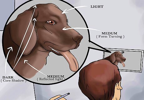 Identify basic light, medium, and dark value areas in the reference. Understanding how light is hitting your subject is the most important factor in making your painting look three-dimensional. Light value areas are most directly facing the light source. There are two types of medium value areas: Planes of the form that are turning away from the light and about to go into shadow. Light is bouncing off of objects behind the subject and hitting them from the opposite side, but much less strongly than the direct light. This is called “reflected light.” Dark value areas are where the least amount of light is shining on the subject because the planes of the form are tangent to the light sources, so they aren’t getting light from either the front or back. They occur between medium value areas and are called “core shadows."
