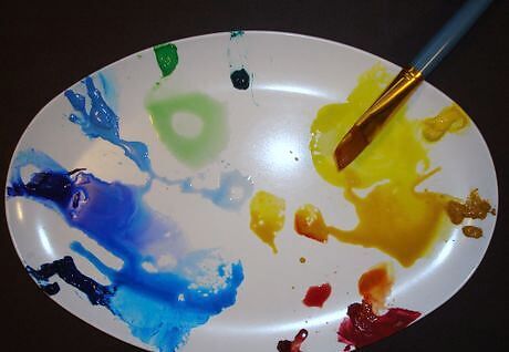 Prepare your paints by pulling with a wet brush blue, green and yellow into the center of the plate and mixing with enough water to create three vibrant puddles of paint.