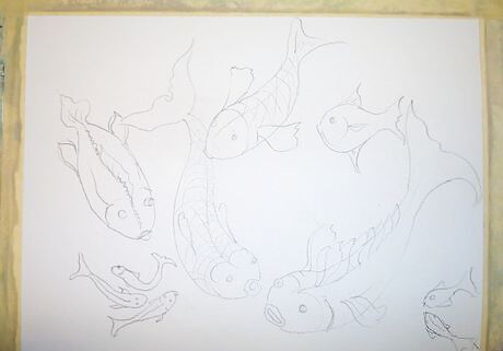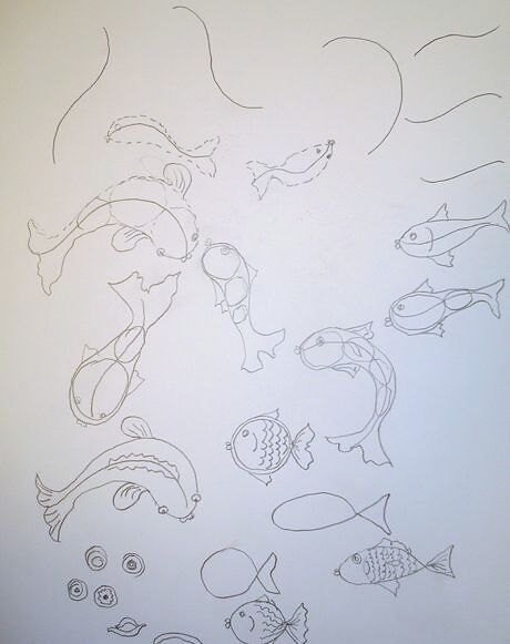 Mount your 11 x 14" watercolor paper onto a double weight foam core board using masking tape on all edges to keep the piece from buckling as you work wet. Draw an odd number of simple fish on your watercolor paper. Use the curved spine to capture them in motion. Have at least two be close up.