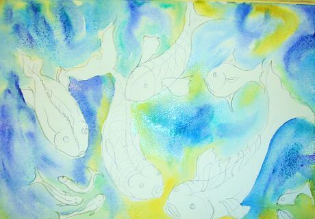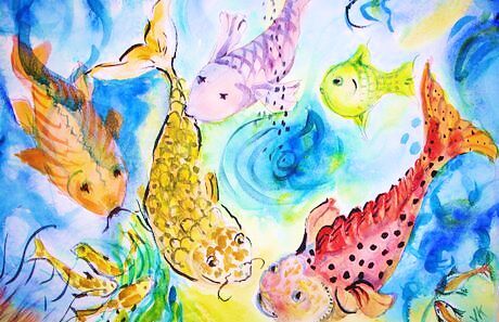 Paint the background first by wetting your paper around the fish with clear water. Use a big, soft brush. Touch one of colors randomly, to the background and quickly add another, floating on pigments until the background is a swirly, abstract array of color.
