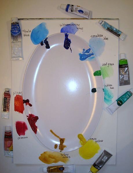 Set up a palette with 1/4 inch of the primary and secondary colors around the edges of a white, plastic dinner plate. Assemble brushes, water, and table salt in a shaker.