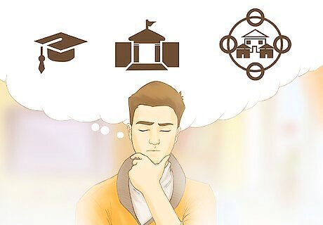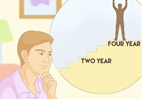 Choose a program length. College programs are generally either two year or four year. Two-year programs are not only more affordable per year, but they are shorter so your overall tuition is much less. Which type you choose depends on what your interests are. The main benefit to two year programs is that not only are they affordable, but they are often highly skills based. This means that you will likely learn a marketable trade or skill that you can immediately take out into the job market upon graduation. They also include the option to upgrade into a four year program. Four year schools are typically about three times as expensive as two year schools per year, and are useful if you want a degree is a specific field like biology, chemistry, math, or many others. Often, four year programs are important requirements to pursue many professions, and in today's competitive job market a four year program is necessary to compete in certain fields. Start by understanding what your interests are and what career you would like to pursue, and then see if it is better served by a two or four year program.