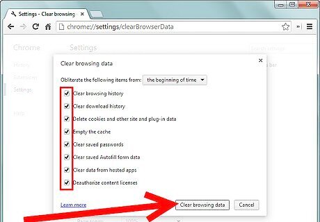 Check all boxes, click the drop-down menu, select "from the beginning of time...", and then hit "Clear browsing data".
