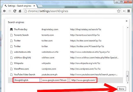 |Type this into the three boxes, be sure to hit ENTER when you are finished. Click "OK". Type the following into the boxes: Google English, google.com/?hl=en, and https://www.google.com/search?hl=en&q=%s&{google:RLZ}{google:acceptedSuggestion}{google:originalQueryForSuggestion}{google:searchFieldtrialParameter}sourceid=chrome&ie={inputEncoding}&?hl=en (Copy and paste)
