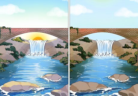 Shoot early in the day or late in the afternoon so the lighting is softer. Light is a huge element in any photograph, and you’ll need to know how it will affect your shot. Specifics such as the direction of light, brightness, and color can all dramatically change the photograph. By shooting early in the morning or late into in the afternoon, you can ensure that the light is softer and less direct, making for a better environment to take quality photos. You can still shoot waterfalls in the middle of the day, but making sure that you have even lighting, may prove more difficult. If the waterfall you intend shoot faces in an easterly direction, the light will most directly affect your shot in the morning. Direct sunlight can cause a series of unwanted distortions to your shot. Try shooting in the late afternoon or evening to negate these effects. Similarly speaking, a westerly facing waterfall might have the best lighting at sunrise.