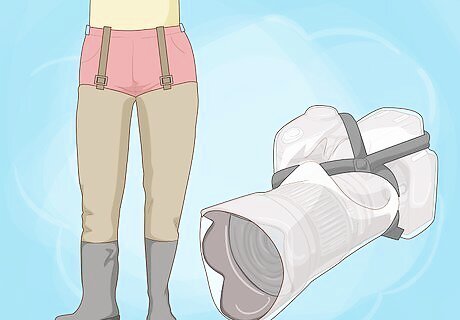 Protect yourself and your equipment. Make sure to watch your footing and check for changing weather conditions. Keep liquid from getting into your camera by investing in a rain sleeve, use sealed plastic bags for accessories, and pack microfiber cloths for cleaning or wicking away water.