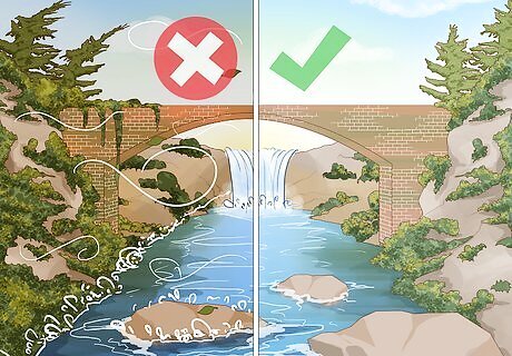 Use a filter to adjust for ambient glare or harsher light. By using a circular polarizing filter, you can cut down on glare, just like a pair of polarized sunglasses do the same. A neutral density filter (or ND filter) will help slow your shutter speed down even further and is great for shooting in bright light or heavy water currents. Consider eliminating the sky from the frame. The sky can compromise your exposure if it is particularly bright. Conversely, an extremely gray and cloudy sky might detract from the waterfall’s beauty.