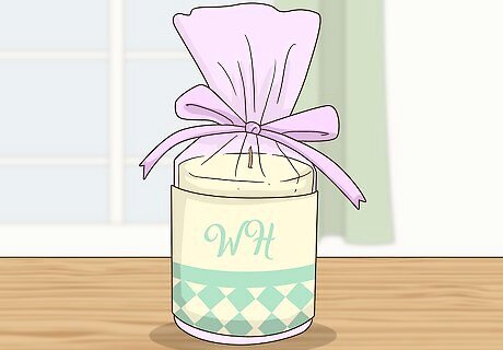 Light up memories with candles. Gift your guests with a votive and candle combination. Select color combinations or designs that reflect your wedding themes, location, or personalities. Keep the candles as simple as possible to keep costs down. For example, if you are getting married near a body of water, a blue votive with a white candle and green ribbon may best reflect your wedding. It will also last for a long time. Personalize the candles with handwritten tags or ribbons. These are inexpensive ways to jazz up a candle even more.