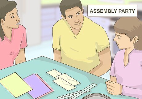 Host an assembly party. It can be time consuming and stressful to assemble favors. Turn it into a fun event by having an assembly party with your family or bridal party members. This can minimize your stress and help you save time before your big day. Make sure to offer your party guests food and beverages for helping you. Gather enough supplies so everyone can participate. These might include: scissors, hole punches, rulers, ribbons, and tags. Set up an assembly line. Allow people to do tasks they are good at or enjoy, such as handwriting cards. Switch up the assembly line after a certain number of favors so every person gets to do each task.