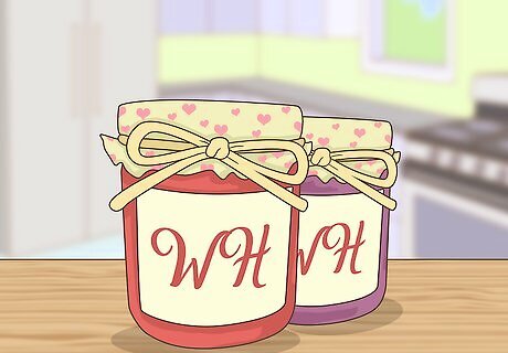 Make sweets for your guests. Baked goods and sweets are a very personal way to let guests remember your wedding. They also won't break your budget because you can buy inexpensive ingredients in bulk. Use old family recipes or try something that reflects the backgrounds of you and your fiancé(e). Decorate your sweets with your initials or in your wedding colors for some extra flair. Some budget-friendly, easy sweets you can make for your guests include: Cookies Pastries Mini cakes or breads Caramel apples Chocolates