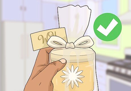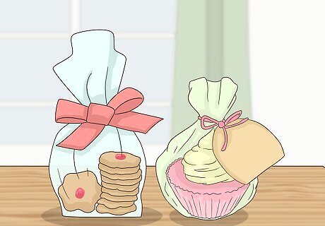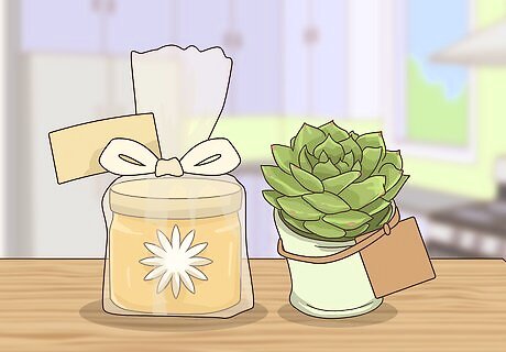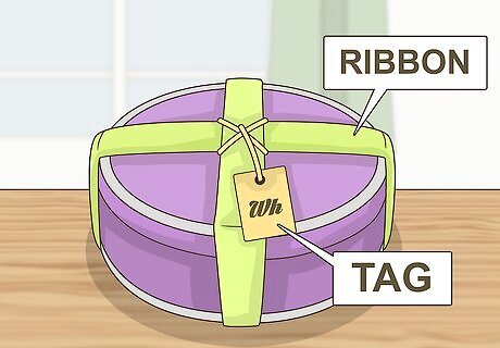 Add personal touches to the packaging. Inexpensive, personalized touches on your favors can go a long way, even on tightest budget. For example, a small tin of cookies with a personalized tag and bright ribbon will catch your guests' eyes and help them remember you when they reuse it. Easy ways to inexpensively personalize the packaging of your favors include: Colorful boxes or cellophane wrapping Ribbons Hand-written tags