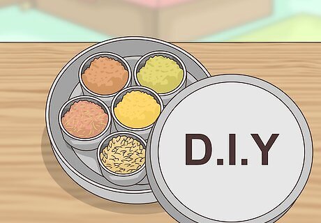 Find easy DIY favors. If you choose to assemble your own favors, opt for a simple project. You can find ideas in wedding and craft magazines or at websites such as Pinterest or The Knot. Putting together a jar of granola or a ribbon around a potted plant will be much easier than hand-painting name tags. Choosing simple DIY favors can keep your budget in line and minimize your overall stress about the wedding. Some ideas for things you can make or assemble yourself include: Spice blends in a small tin S'mores or hot chocolate mix in a jar Candy bar with different types of sweets Potted plant with simple ribbon and hand-stamped tag Jordan almonds wrapped in tulle with a pretty ribbon Jar of local syrup, sauce, or oil with a personalized sticker of your names and wedding date Balsam pine sachet