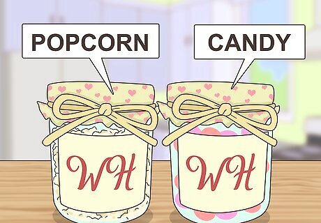 Offer a variety of favors. If you can't decide on just one favor, consider giving several different types that reflect your wedding. This can ensure that every guest gets something they like. For example, you could offer three different types of candy in small jars. Let guests choose between a small jar of popcorn or a small succulent plant. Keep your overall favor total in mind. Figure out how many options you would like to give and then divide this number by the total. This way, you don't order too many favors and stay within your budget.