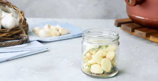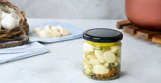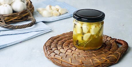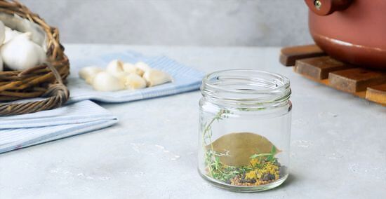 Fill each jar with desired spices and herbs. Four pint-sized mason jars should accommodate one pound of garlic. Into each of the four mason jars, place 1/4 of the desired spices, along with one sprig of thyme and one bay leaf.