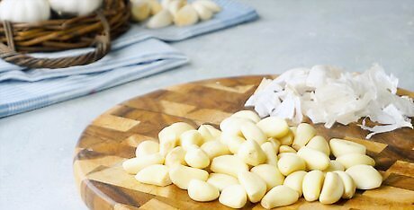 Peel the garlic. When you're dealing in bulk, peeling one pound of garlic can get tedious. You'll want to peel those suckers efficiently. There are two basic ways you can peel a lot of garlic very quickly: Shake them up. Break up the garlic bulbs and place the cloves into a metal bowl. Invert another identical metal bowl over the first bowl to create a locked seal. Grip the bowls tightly with both hands and shake vigorously for up to 30 seconds. Your cloves should be completely peeled! Blanch the garlic. Break up the garlic bulbs and sink into boiling water for 30 seconds. Remove and put them into cold water to stop the cooking. Separate the peel from the clove in the water. The peels should easily slide off after they are blanched.