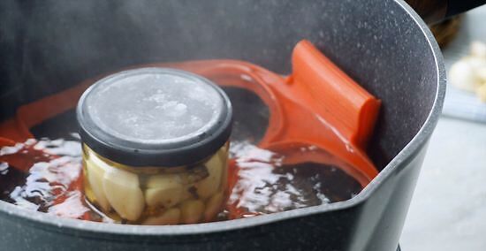Leave the jars in the canner, on low boil, for 15 minutes. The process of heating the pickling solution up — and then eventually cooling it down — will create a vacuum seal in the headspace, preserving the garlic.