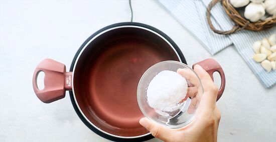 Put a clean canner on the burner over low heat. You can let it heat up while you prepare the garlic and pickling solution for canning.