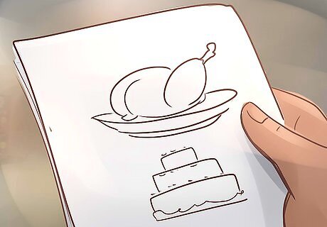 Plan the refreshments. Once you know how many people you will be inviting, you can start planning for the food. You need to figure out what kinds of food you want to serve and how much of it to get for the event. These considerations largely depend on what time of day your event will be held. For example, if your event is at 7pm, your guests will probably expect you to provide food for them and they probably won’t eat dinner before the event. In this case, you’ll need to supply an entrée, some sides, and a dessert, as well as some beverages. If your event begins at 8am, it would be good to offer coffee and juice along with some croissants or doughnuts.