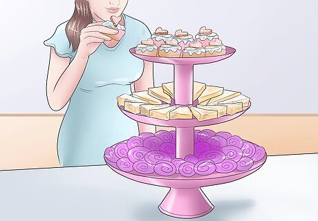 Arrange the food. If you have a large party or a small table, you may arrange the food buffet-style and have the guests stand or sit in your living room or garden. If you have space to seat your guests around the table, place the food in the center of the table, or divide each dish among multiple serving platters to make it easy for everyone to reach. If using a three-tiered tray and serving a traditional afternoon tea, the proper etiquette is to place scones on the top tray, sandwiches on the middle, and sweets such as small cakes or candies on the lower.