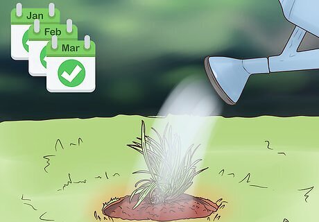 Water the grass daily for the first 3-6 months. Be sure to moisten the entire area. You'll need to keep a closer eye on your mondo grass in the first couple of years to ensure proper root systems are established. Before watering, feel around the base of the plant to see if the soil is dry. If it is, water it. Mondo grass is low maintenance. You'll only need to water it when you see signs of browning or wilting after the grass completely fills in.