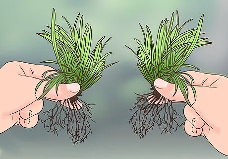 Separate the grass into handful-sized tufts with lots of roots. You'll want to make sure the tufts of grass have plenty of roots, as a well-established root system will be essential for your plant to thrive long-term. Remember that tufts should be no larger than 3 inches (7.6 cm) wide, or they won't fit properly in the planting holes.