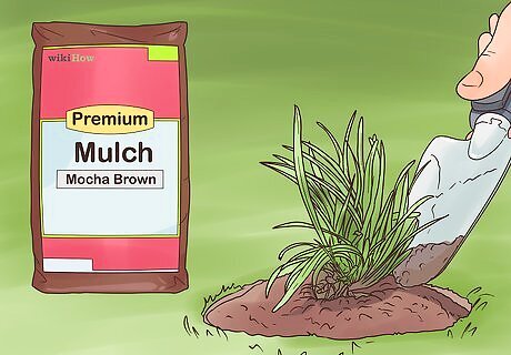 Edge the planting area with mulch. Edging the area with mulch will help the soil retain moisture, prevent weeds, and keep the mondo grass from spreading outside the desired area. Be careful to not smother your mondo grass with mulch. Shredded bark is the most common type of mulch and a fine choice for your mondo grass. You can purchase it anywhere that sells gardening supplies. Ophiopogon planiscapus, more commonly known as black mondo grass, is also an option to edge the area. However, if you're planting your grass in a heavily shaded area, don't expect the dark leaf color in the black mondo grass. It will likely stay a shade of green.