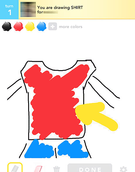 Move to the drawing board. This is where the pictures are created. By default, you are only allowed the colors black, yellow, red, and blue. Once you achieve a certain amount of coins, you can use them to purchase other colors. Choose the "pencil" icon to draw, "eraser" icon to erase lines, and the trash barrel to start out with a new blank screen. Tap on "Done" when you're finished with your drawing.
